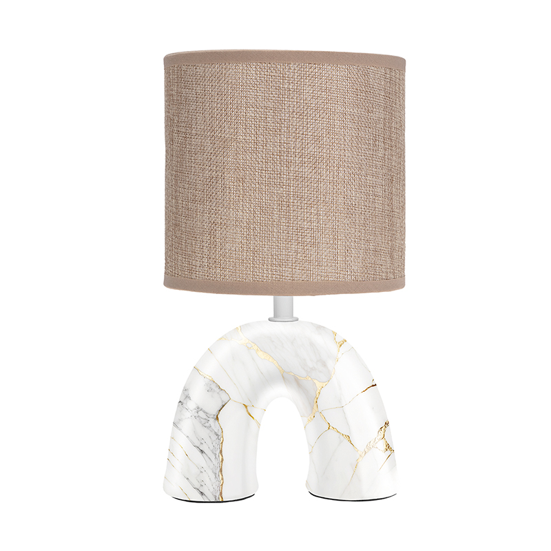 Декоративный настольный светильник с основанием в форме дуги под золотой мрамор и бежевым абажуром станет современным и стильным интерьерным украшением.При производстве используются такие материалы как керамика, текстиль и металл.