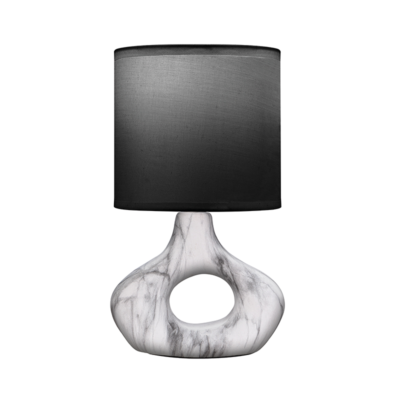 Декоративный настольный светильник с основанием в форме кольца под белый мрамор и черным абажуром станет современным и стильным интерьерным украшением.При производстве используются такие материалы как керамика, текстиль и металл.
