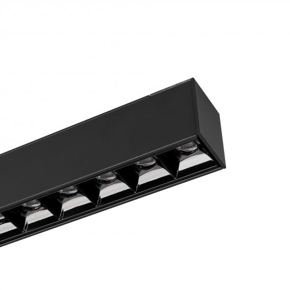 Светильник для магнитных треков шириной 45мм, 6Вт. Цвет свечения ТЕПЛЫЙ 3000K, световой поток 400лм, угол 15°, CRI>90. Корпус прямоугольный, металл, цвет черный, IP20. Размеры LxWxH 163x35x43мм. Входное напряжение DC24V, мощность 6Вт. Драйвер DС24V/AC230V поставляется отдельно. Диммируется только с 026407(1), 027633.