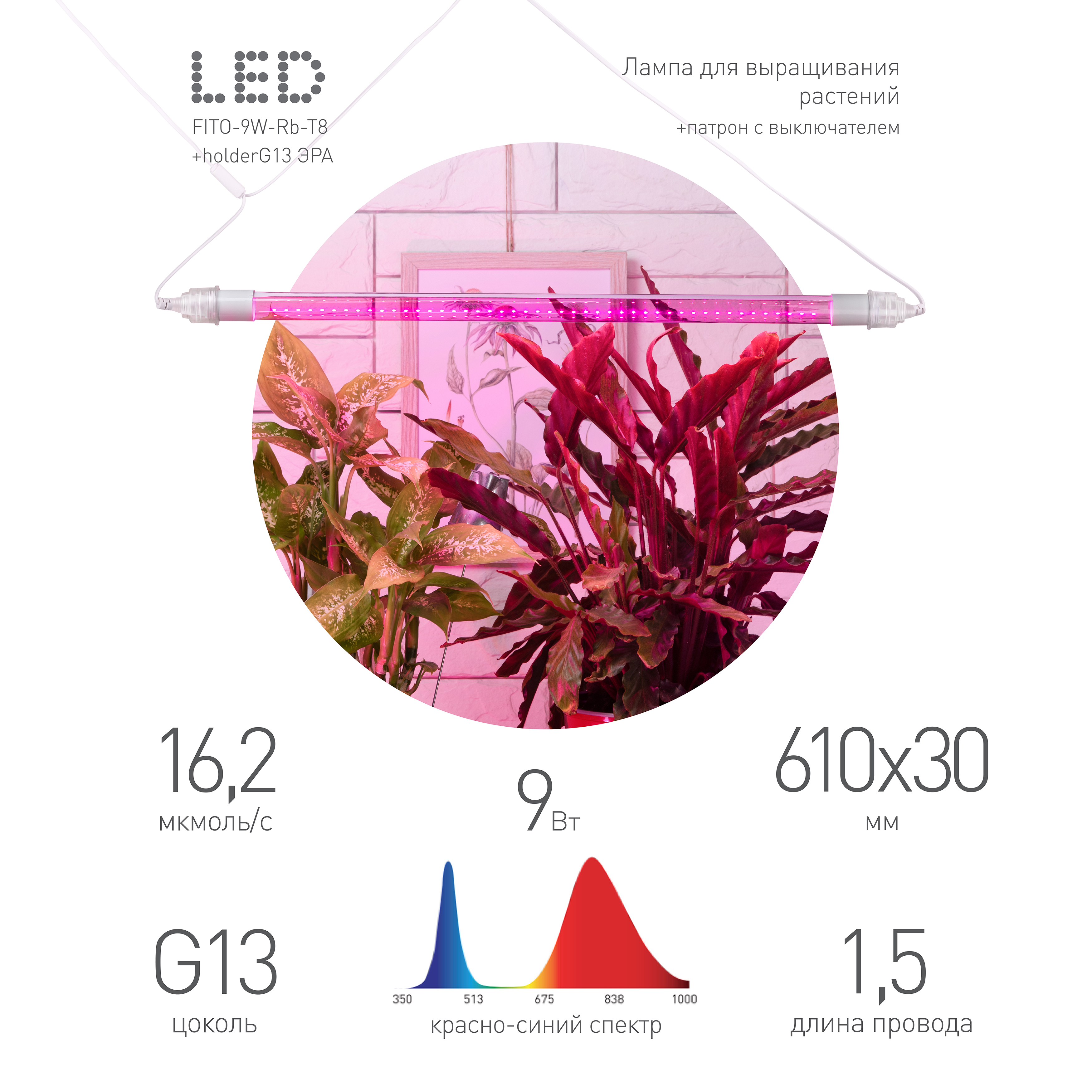 Линейный фито светильник FITO-9W-RB-Т8+holderG13, красно-синего спектра IP 65 c выключателем и вилкой позволит без дополнительных усилий подключить лампу T8 и разместить ее в любом удобном для вас месте. Белый цвет удачно впишется в любой интерьер, а компактный размер не займет много места. от компании ЭРА необходимая вещь для Ваших растений. Она позволит Вам не только красиво оформить интерьер дома цветами, но и собрать небольшой урожай. Подойдет для зелени, капусты, а также некоторых видов пасленовых. 46 светодиодов с направленным фиолетовым светом ускоряют процесс фотосинтеза. Прозрачное светопроницаемое стекло эффективно воздействует на рассаду. Фитолампа рекомендована для эксплуатации в помещениях с естественным светом и обычными лампами 1200 К. Небольшие габариты: длина 60 см, диаметр колбы - 2,6см, длина шнура питания - 1,5 м позволяют разместить ее в комнате небольшой площади. Идеальна для вертикального выращивания. Площадь освещения составляет 0,7 м2. Линейный фито светильник FITO-9W-RB-Т8+holderG13 безопасен для человека. Коэффициент пульсаций в 5% снижает риск воздействия на глаза. Цветовая температура в 1200 К подарит приятное свечение. Лампа ЭРА залог красивых цветов и спелого урожая.
