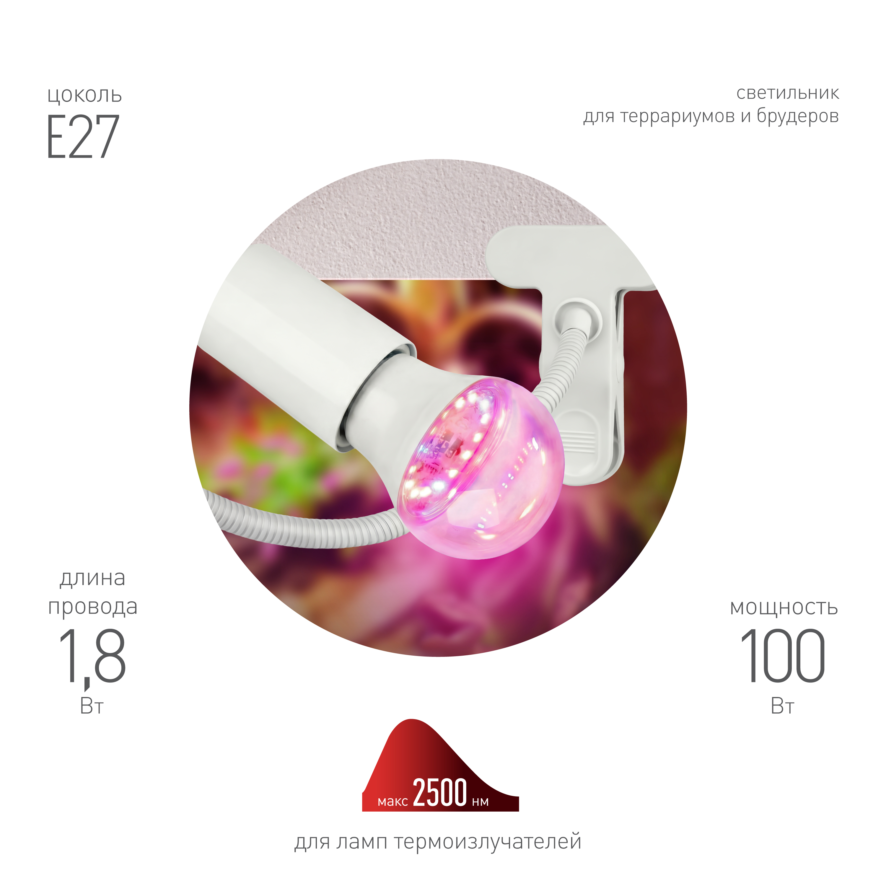 Светильник ЭРА FITO-E27-FLEX-100W-GR — это универсальное и элегантное решение для тех, кто заботится о здоровье растений, рептилий и молодняка птицы. Комбинация функциональности фитосвета и удобства клипсового крепления делает эту модель идеальной для использования в террариумах, вивариях и брудерах: он обеспечивает целенаправленное освещение, создаёт комфортные микроклиматические условия и помогает формировать естественные поведенческие и физиологические ритмы животных.Дизайн устройства продуман до мелочей: корпус выполнен из прочного, термостойкого пластика благородного белого оттенка, который гармонично смотрится в любом интерьере. Надёжная металлическая клипса с защитными накладками позволяет крепить светильник к различным поверхностям — стеклу, древесине, металлическим рамам — без риска повреждений. Гибкая стойка (gooseneck) обеспечивает плавную и точную регулировку направления луча, позволяя устанавливать оптимальное освещение под любым углом и на необходимой дистанции.