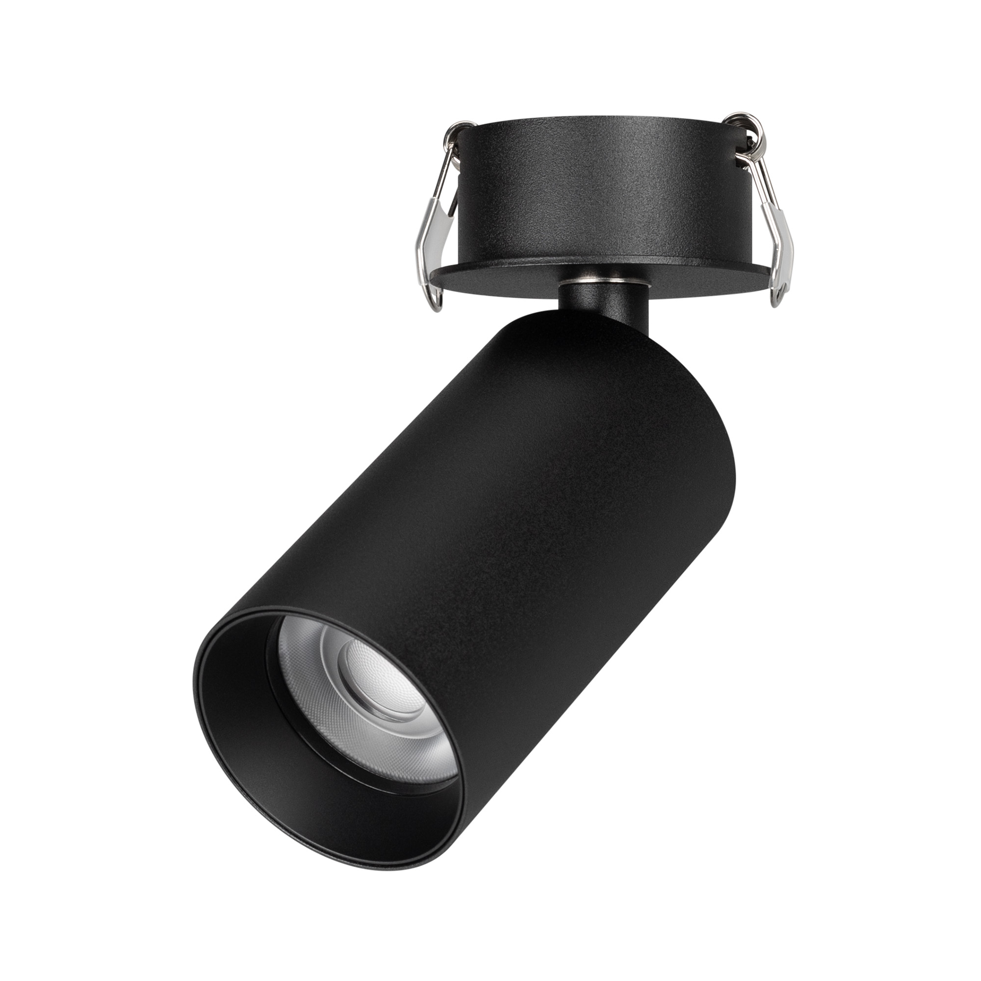 Светильник встраиваемый откидной. Мощность 9 Вт, св. поток 560 лм, 62 лм/Вт, теплый 3000 K, CRI>90, угол 60°, напряжение питания 230 В. Черный круглый корпус из алюминия, экран PMMA, степень защиты IP40. Размер: диаметр 50 мм, высота светового модуля 90 мм, высота основания 1,5 мм. Угол поворота 350°, угол наклона 90°. Монтаж встраиваемый, установочное отверстие: диаметр 55 мм, глубина 26 мм. Драйвер в комплекте 22-42 В, 200 мА, пульсация <1%.