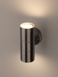 Светильник декоративный настенный WL16 создает интересные световые композиции, подчеркивает структуру материалов. Подходит для наружного уличного освещения и влажных помещений. Цоколь для источника света GU10, напряжение питания 220В ~50/60Гц, материал нержавеющая сталь + пластик, цвет светильника хром, размер 92*160*77 мм, D60 мм, максимальная мощность лампы 50 Вт, степень защиты IP44
