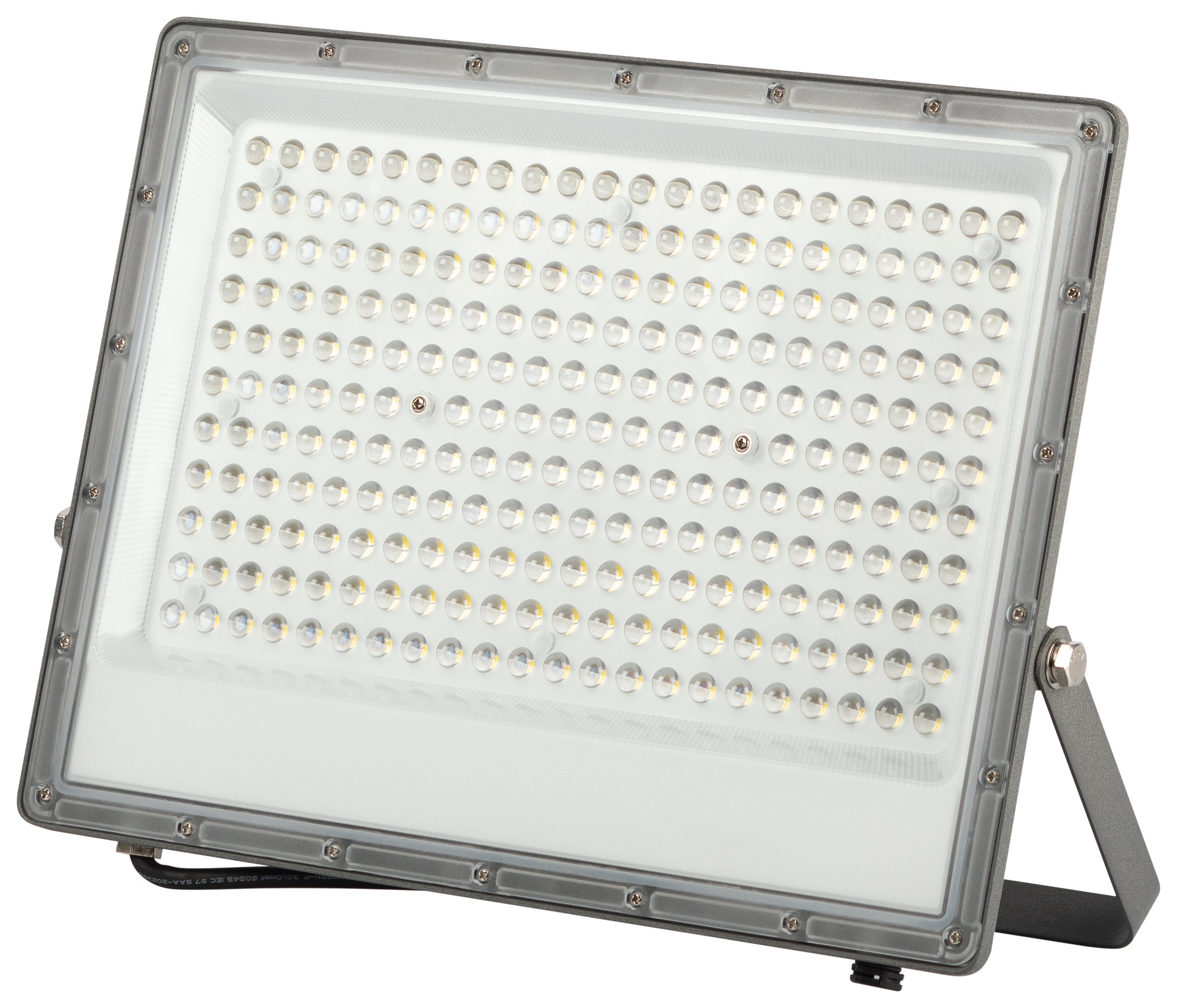 Прожектор светодиодный уличный с высоким световым потоком. Корпус -серый, изготовлен из прочного алюминия, имеет рассеиватель из поликарбоната с интегрированными линзами, имеет клапан выравнивания давления. Устойчив к механическим воздействиям, защищен от дождя и пыли, работает при широком диапазоне температур. Отличается простой и быстрой установкой: есть кронштейн специальной формы и регулировочные болты для выбора направления света. Длина кабеля 30см