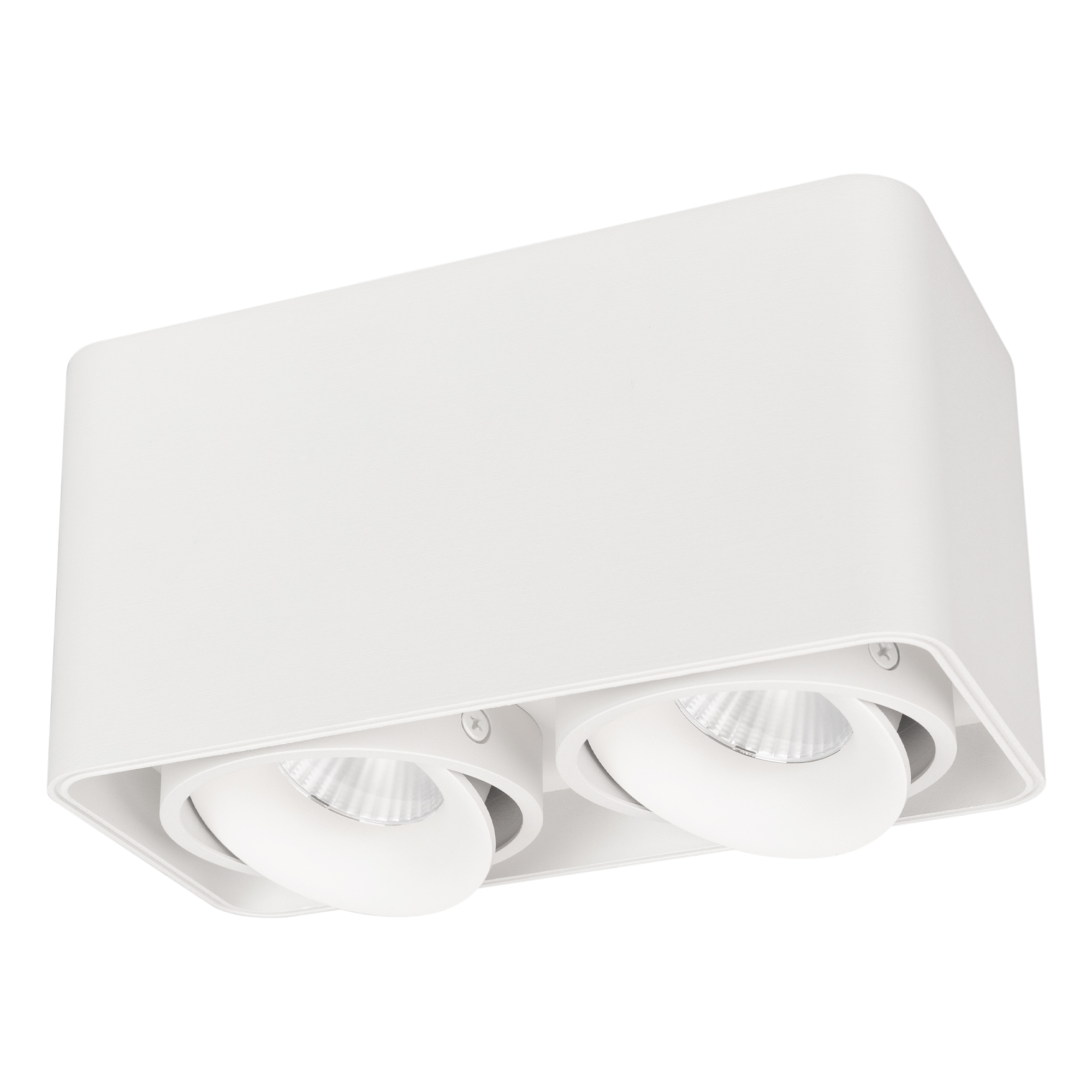 Накладной интерьерный светильник. Мощность 16 Вт, св. поток 1490 лм, 98 лм/Вт, теплый 3000 K, CRI>90, угол 45°, регулируемое направление луча 30°, напряжение питания 230 В. Белый квадратный корпус из алюминия, степень защиты IP20. Размер: длина 195 мм, ширина 100 мм, высота 100 мм. Монтаж накладной. Драйвер 26-40 В, 400 мА, пульсация <5%.