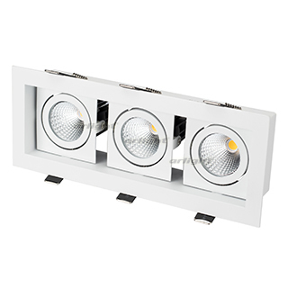 Встраиваемый карданный светильник. Угол 38° / 3x9Вт / ТЕПЛЫЙ БЕЛЫЙ 3000K / 2240лм, CRI>80. Корпус из белого алюминия. Питание AC180-240V, 27Вт, в комплекте 3 драйвера 200mA 30-45V. Размеры LxWxH: 260х102x85мм, отверстие для установки 240x85мм.