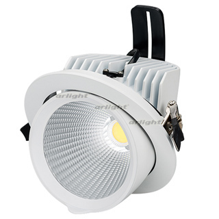 Поставка под заказ от 100 шт. Встраиваемый поворотно-выдвижной светильник. Мощность 30 Вт, св. поток 2200-2500 лм, 73-84 лм/Вт, теплый 3000 K, CRI>90, угол 38°, напряжение питания 230 В. Белый круглый корпус из алюминия, экран стекло, степень защиты IP20. Угол поворота 350°, угол наклона 45°. Размер: диаметр 148 мм, высота 140 мм. Монтаж встраиваемый, установочное отверстие: диаметр 140 мм. Драйвер 25,5-43 В, 700 мА, пульсация <3%.
