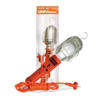 Переносной светильник ТМ UNIVersal с выключателем 20м 966U-0110 служит для освещения пространства на удалении от стационарной розетки. Корпус оранжевого цвета изготовлен из пластика, обеспечивая тем самым дополнительную безопасность от поражения электрическим током. Металлический отражатель имеет антикоррозийное покрытие и снабжен защитной сеткой. Выключатель расположен на корпусе, что облегчает использование. Длина провода - 10 метров. Крюк для подвеса позволяет освободить руки для работы. Цоколь Е27 подходит для любого типа ламп (мощность лампы накаливания не выше 60Вт). Изделие пригодится для работы в гараже или мастерской.
