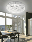 Плафон LED люстры декорирован изящным узором. Нежные ветки с лепестками гармонично смотрятся на круглом плоском корпусе. Такой светильник прекрасно подойдет для оформления гостиной, коридора, спальни или детской.