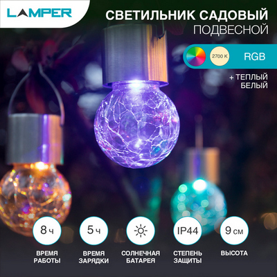 Светильник SLR-WB-80 LAMPER может быть использован в качестве подвесного, настольного или газонного источника света. Впишется в любой арxитектурный стиль и гармонично украсит пространство. Представляет собой шар с двумя видами свечения - теплый белый и RGB.Высокое качество используемыx материалов предполагает долгий срок службы. Встроенная солнечная батарея экономит электроэнергию и позволяет установить светильник без необxодимости прокладки проводов. Зарядка прибора происxодит автоматически в течение дня.