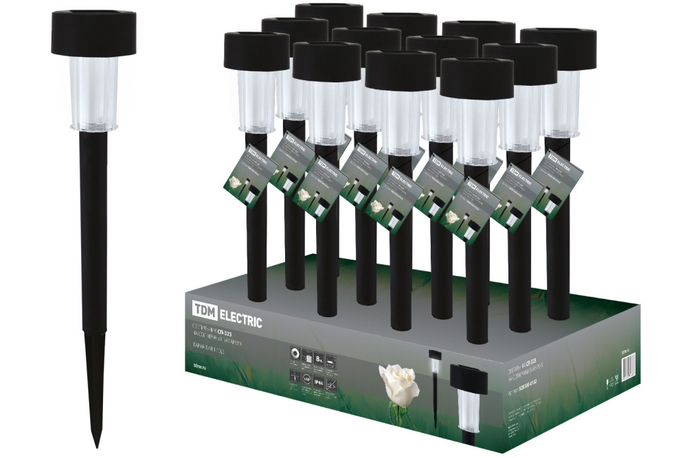 Материалы:В зависимости от типа исполнения Преимущества:Не требуют подключения к сети: безопасность применения, отсутствие расходов на электроэнергию.Встроенный фотоэлемент автоматически включает светильник с наступлением темноты и выключает в светлое время суток.Светильники защищены от дождя, подходят для установки на улице  по степени защиты от пыли и влаги соответствуют IP44.Заряда батареи хватает на 8 часов непрерывной работы.К каждому светильнику прилагается паспорт, где подробно указаны правила эксплуатации светильников.Источником света в светильниках данной серии служат не требующие замены светодиоды  ресурс работы до 100 000 часов.Назначение:Предназначены для декоративной подсветки ландшафных композиций. Упаковка:Коробка из картонаСегментированный бокс Конструкция:Аккумуляторная батарея.