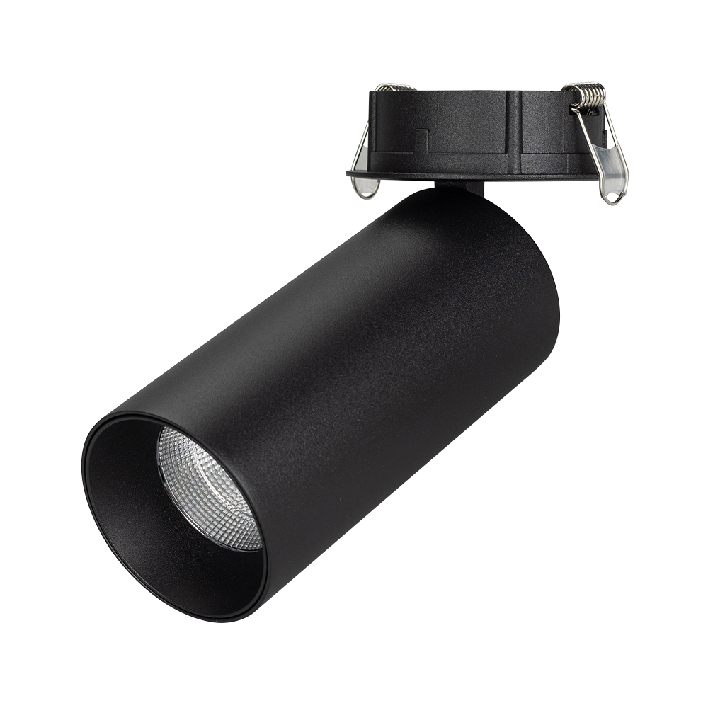 Встраиваемый откидной светильник 8Вт, черный круглый корпус, черная вставка, металл.Цвет свечения ДНЕВНОЙ 4000K, св.поток 570лм, CRI(Ra)>80, угол 40°. Размер DxH Ø65x174мм. Установка в отверстие Ø75мм. Драйвер встроенный PRI:220-240VAC, SEC:DC 200mA 30-43V, 8Вт.