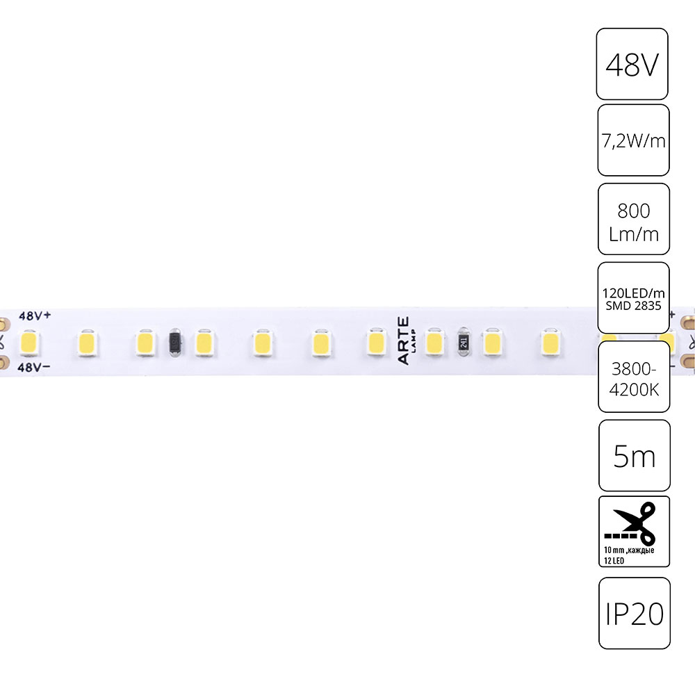 Светодиодная лента 48В 7.2Вт/м 800Лм/м 4000К 90+ 10мм SMD2835 120шт/м 5м IP20 ArteLamp