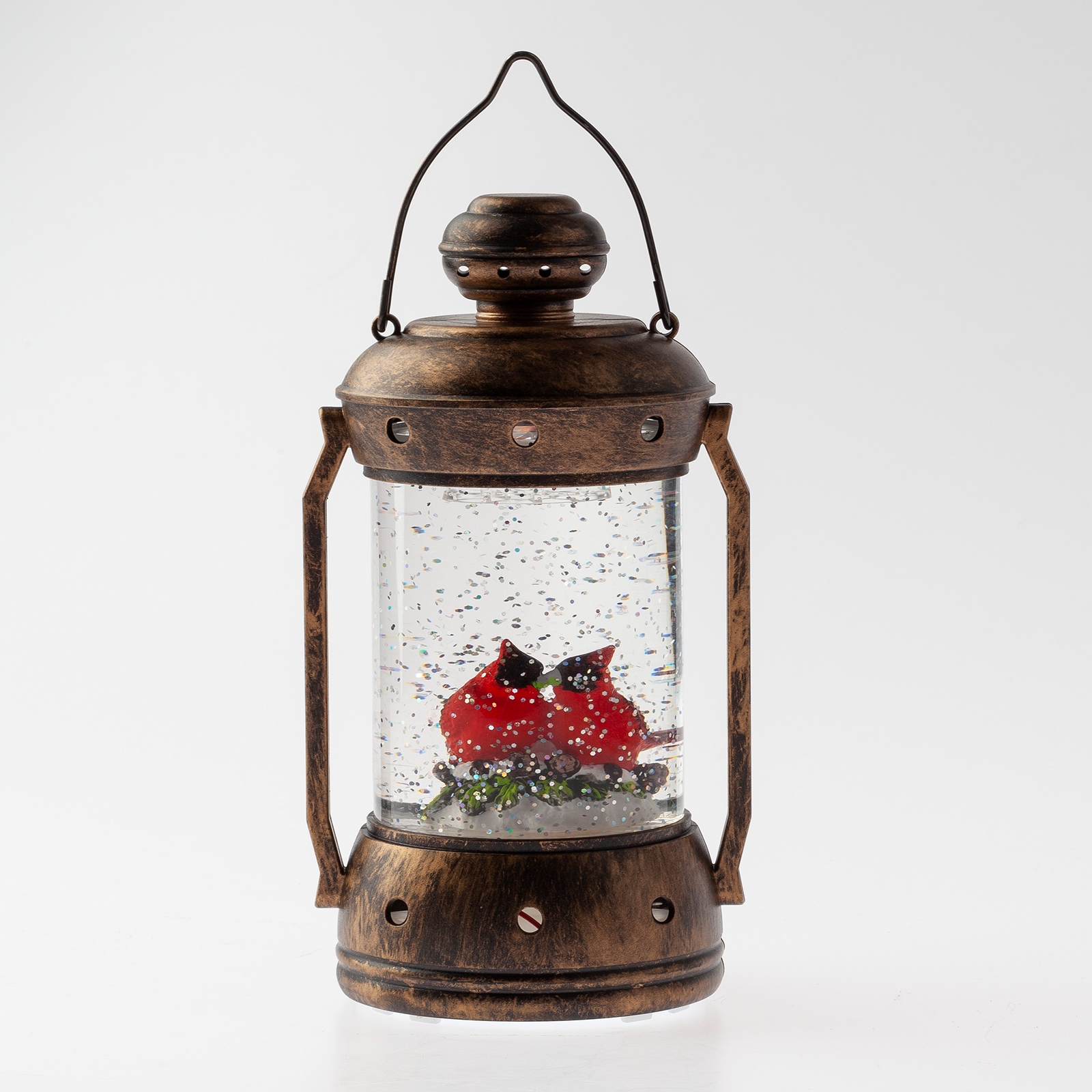 Новогодний светодиодный светильник ЭРА ENGDS-12 "Красный кардинал" высотой 18 см (арт. Б0051944) создаст у Вас дома праздничную атмосферу. Светильник-фонарик выполнен из ПВХ и окрашен под медь, внутри стекла расположены блестки, создающие эффект падающего снега. Внутри фонаря находятся фигурки двух красных кардиналов, они подсвечиваются 1 светодиодной лампочкой сверху. Декоративный светильник работает от 3 батареек АА, степень защиты IP20 (рекомендуется использовать в помещениях), автоматическое отключение через 6 часов. Он станет прекрасным украшением кухни, гостиной, а еще его можно использовать в спальне как ночник. Настольный винтажный фонарь - это необычный подарок на Новый год или Рождество, который понравится взрослым и детям. Новогодний декор для дома всегда поднимает настроение.