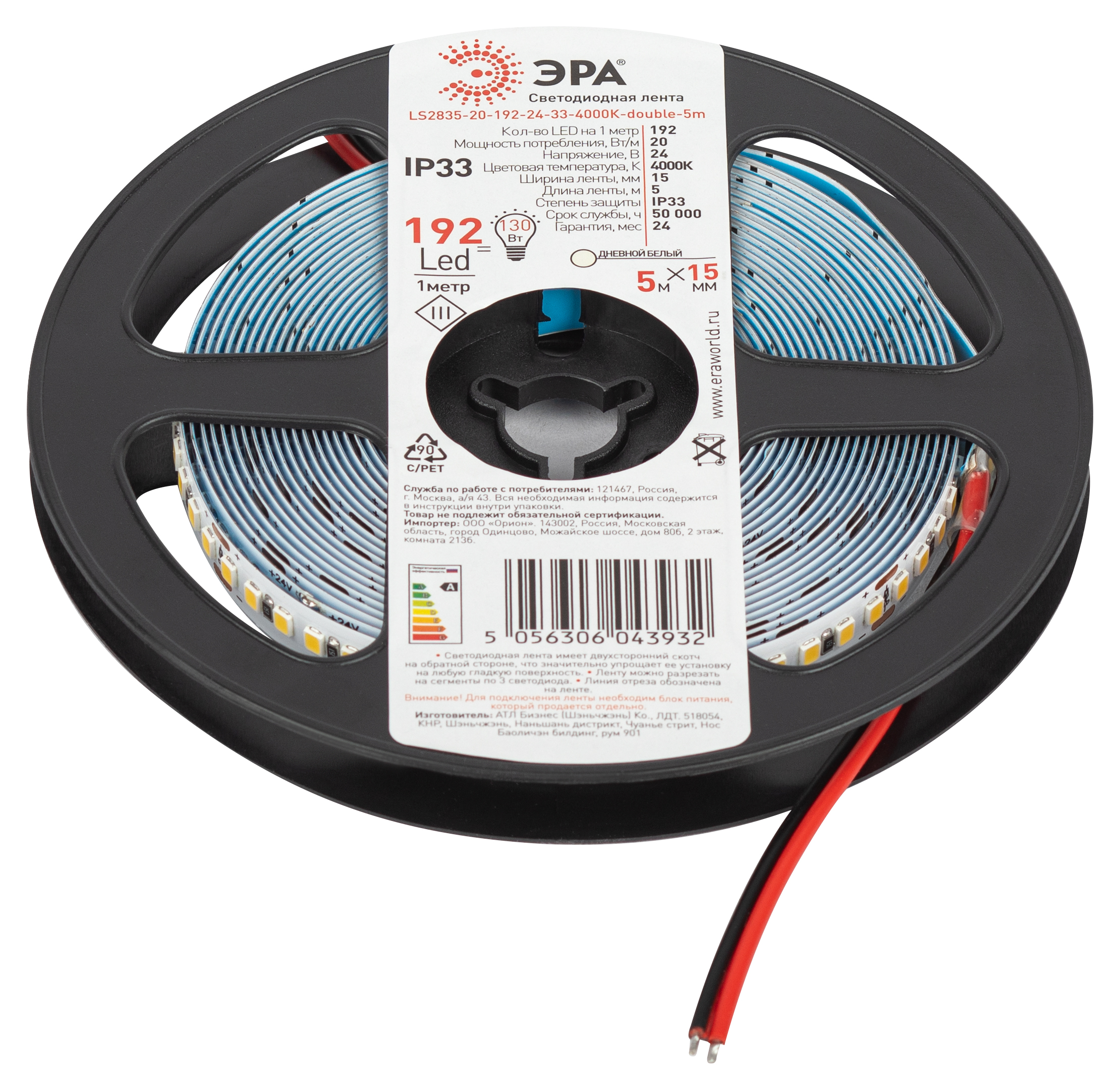 ЭРА Лента светодиодная LS2835-20-192-24-33-4000К-double-5m (25/50/300) со степенью защиты от пыли и влаги IP20 - современный способ создания внутреннего освещения, подсветки ниш, лестничного пространства, систем хранения, а также декоративного и художественного оформления любых объектов и форм в помещениях. Легко и быстро устанавливается на любой гладкой поверхности с помощью скотча, расположенного на оборотной стороне ленты Используя алюминиевый профиль, можно создавать необычные и функциональные решения освещения в Вашем интерьере. Рабочее напряжение ленты составляет 24В, а мощность равна 20Вт/м. Светодиодная лента обладает световым потоком 1300 Лм/м, и цветом свечения - дневной белый (4000 К)ВНИМАНИЕ: