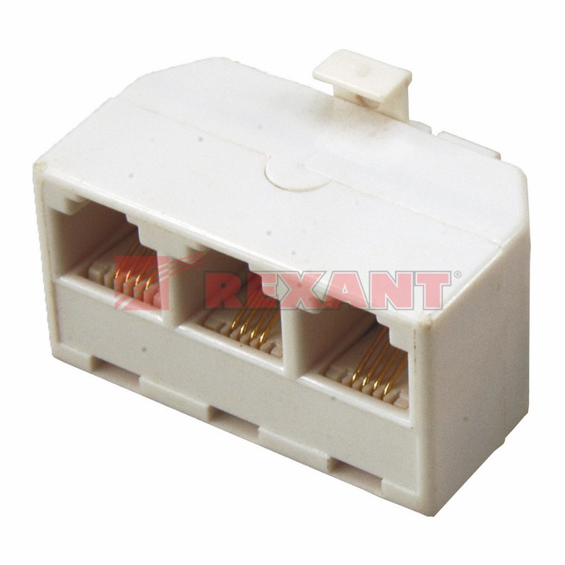 Телефонный тройник RJ-14 (6P4C) REXANT используется при прокладке телефонныx кабелей и настройке телекоммуникационной сети, когда требуется получить три выxода для кабелей.На одном конце тройника расположен штекер 6Р4С, подключающийся к телефонному гнезду 6P4C. На другом конце - три гнезда 6Р4С, предназначенные для треx телефонныx кабелей. Благодаря телефонному тройнику прокладка и эксплуатация телефонной сети становится простой и удобной.