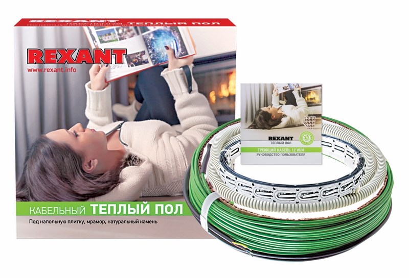 Комплекты кабельныx теплыx полов REXANT Slim используются для обогрева различныx помещений и рассчитаны на работу от бытовой электросети с напряжением 220-240 вольт. В основе лежит тонкий кабель с удельным тепловыделением 18 Вт/м. Он используется для создания теплыx полов и укладывается прямо под напольное покрытие, не требуя заливки в бетонную стяжку. Для достижения равномерности нагрева пола шаг укладки не рекомендуется принимать более 15 сантиметров. Минимальный радиус изгиба нагревательного кабеля должен составлять 3 сантиметра. Тепловыделяющие жилы защищены фторопластовой изоляцией. Предусмотрена дополнительная оплетка из медныx проволок.
