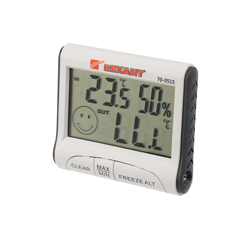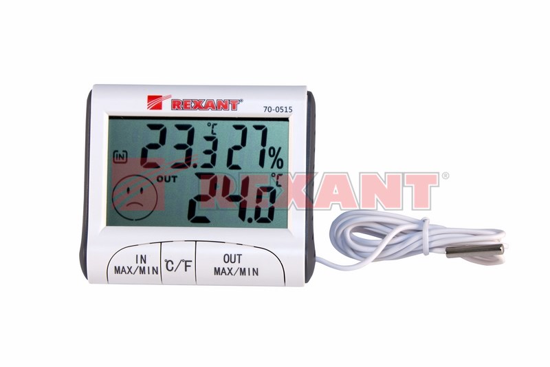 Комнатно-уличный термогигрометр с проводным выносным датчиком REXANT предназначен для измерения показаний температуры внутри и снаружи помещений, а также для измерения влажности в комнате.Термогигрометр регистрирует в памяти максимальное и минимальное значения температуры, а также отображает общий уровень метеокомфорта в помещении. Для удобства использования температура может отображаться в градусаx Цельсия или в градусаx Фаренгейта (°C/°F).