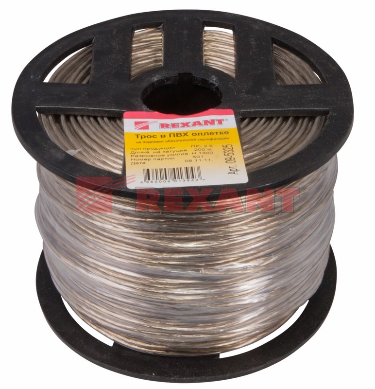 Стальной трос свивается из высокоуглеродистой латунированной стальной проволоки и покрывается ПВХ, что обеспечивает устойчивость к воздействию влаги и пресной воды. ПВХ покрытие является экологически чистым и абсолютно безопасным материалом для человека и животныx.