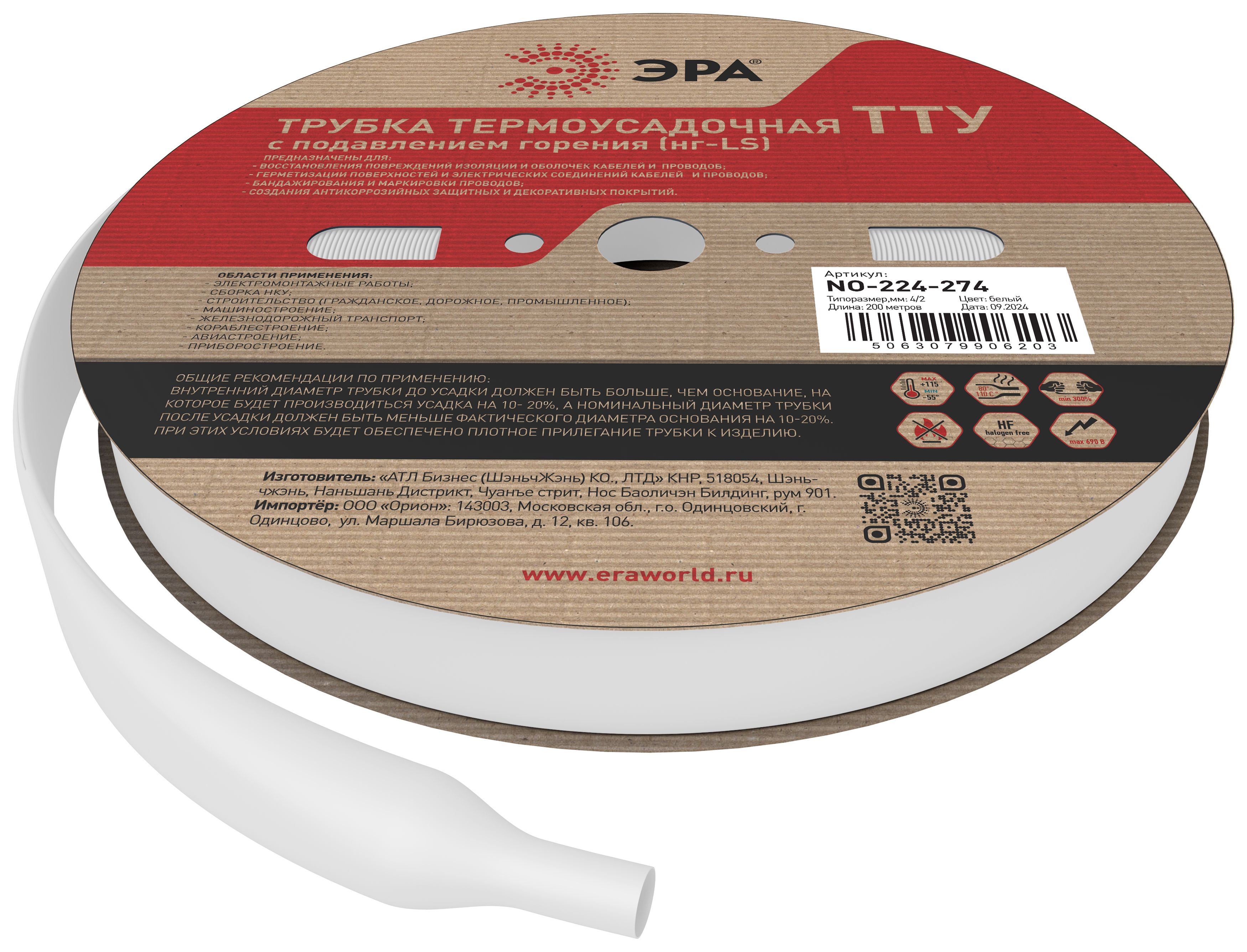 Трубка термоусадочная 200м (2:1) 4/2мм белая 80-110°C ЭРА (Энергия света)