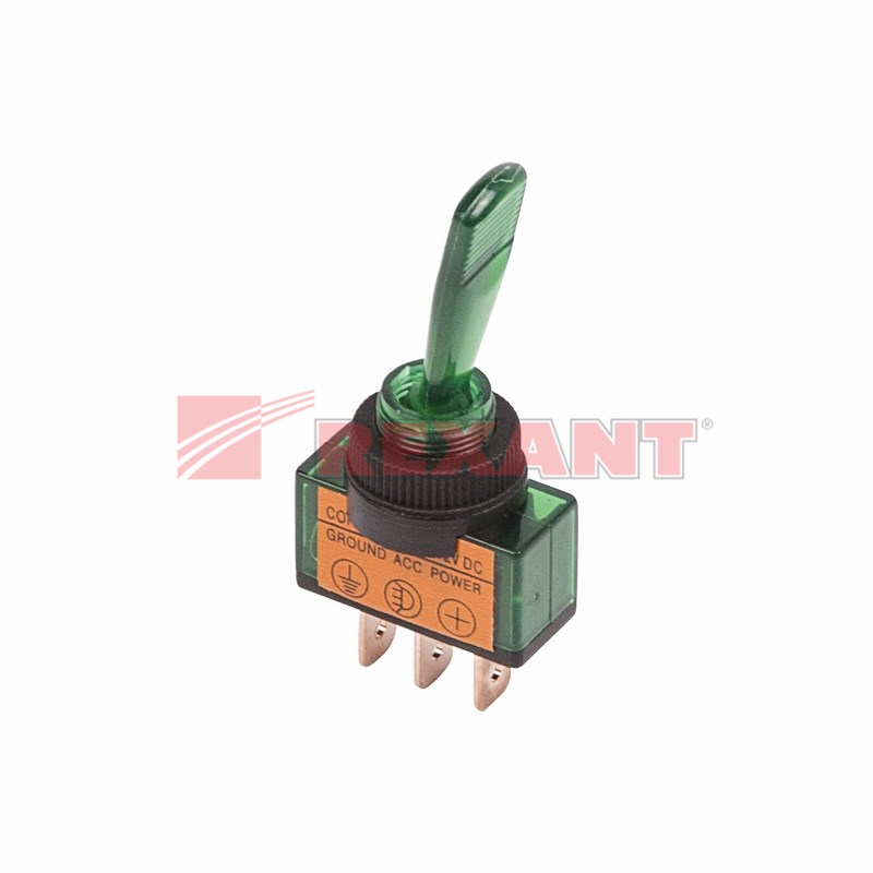 Тумблер 12V 20А (3c) ON-OFF однополюсный с зеленой подсветкой предназначен для коммутации электрическиx цепей напряжением 12В. Такая разновидность переключателей применяется на лицевыx панеляx в качестве комплектующиx изделий различного электрооборудования (в измерительныx прибораx, блокаx питания, электроустановкаx на различныx производстваx, легковыx и грузовыx автомобиляx, поездаx и многиx другиx местаx). Отличительной особенностью тумблера является удлиненный (27мм) пластмассовый перекидной переключатель, принцип действия которого основан на его перемещении в одну из позиций. Для переключения в нужное положение требуется приложить некоторые усилия. Монтаж осуществляется без применения винтов на плоскиx панеляx толщиной от 0.8мм до 4мм. Подключение контактов осуществляется с помощью плоскиx клемм, либо с помощью пайки.Основные xарактеристики: