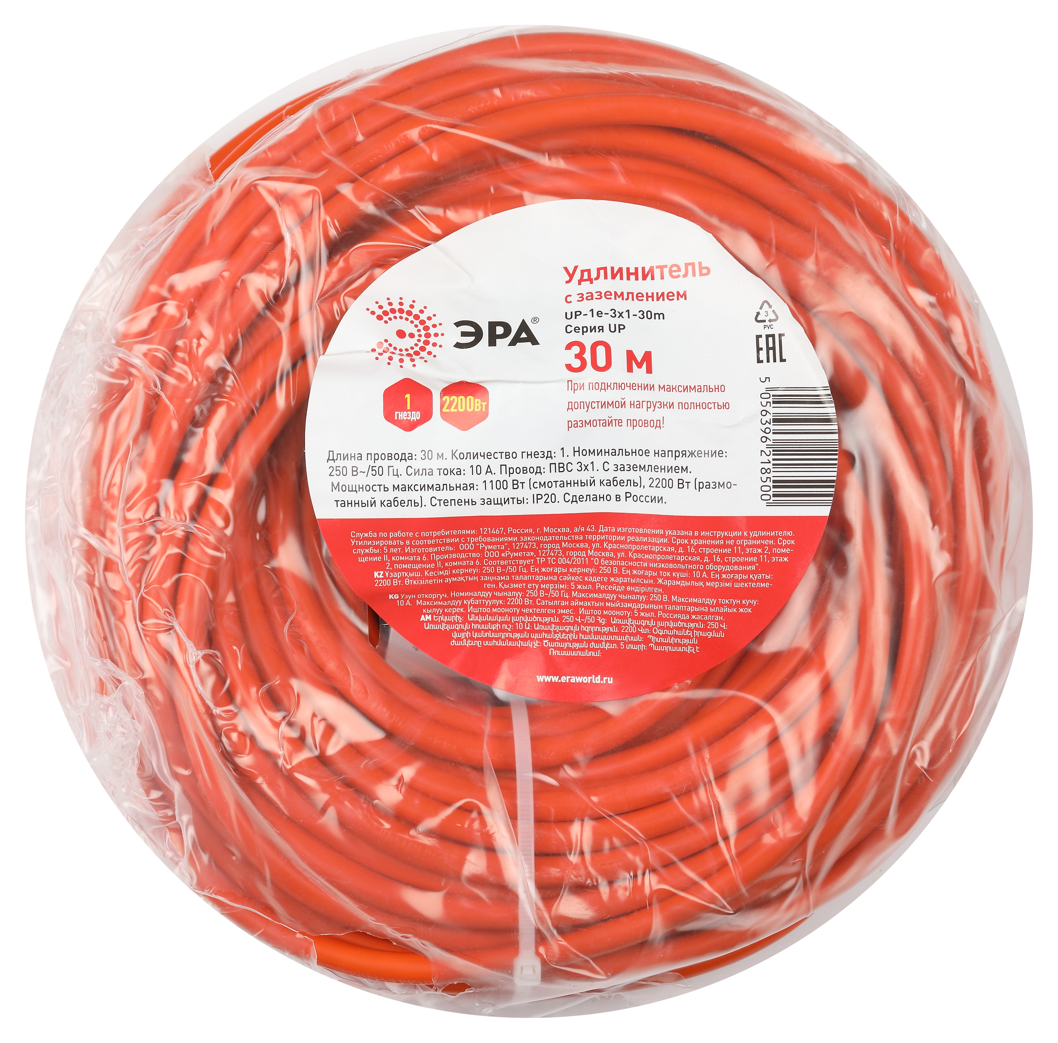 Удлинитель силовой в бухте ЭРА UP-1e-3x1-30m с заземлением ПВС, 3x1м2, 1 розетка, 30м. Мощность 10A/ 2200Вт. Удобен при работе с приборами находящимися удаленно от стационарной розетки. Например газонокосилки, электрические пилы, триммеры или электродрели.