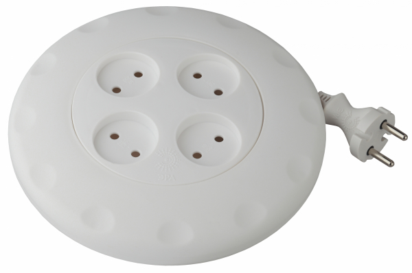 Удлинитель ЭРА Calypso. Катушка - удобный ручной механизм сматывания провода. Максимальная мощность - 10А/2200В. Материал копуса - полипропилен с антипиренами (негорючий). Контактные группы - латунь.
