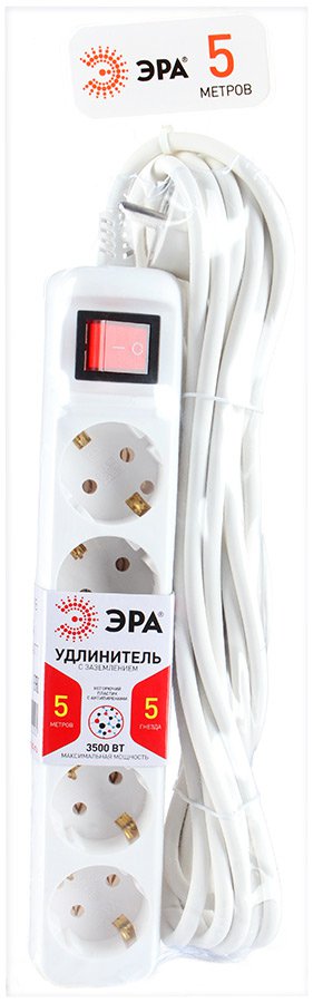 Удлинитель электрический Эра U-5es-5m-3x1 с заземлением, с выключателем, ПВС, 3x1мм2, 5 розетки, 5 м. Рассчитан на максимальную мощность 16А/3500 Вт. Удлинитель Эра станет Вашим надежным помощником, если Ваши любимые электроприборы находятся далеко от розеток. Провод в удлинителях Эра сделан из 100% меди, что делает его абсолютно пожаробезопасным. Корпус выполнен из ударопрочного и негорючего пластика (полипропилен). В моделях с заземлением у вилки есть кольцо для удобного извлечения из розетки. Модель удлинителя на 16А позволяет подключить мощные бытовые приборы общей нагрузкой до 3500Вт. Не бойтесь включить чайник, обогреватель, микроволновку или другие электроприборы. Толстый провод удлинителя Эра гарантирует полную безопасность. Дизайн удлинителя разработан в России командой Эра Style.