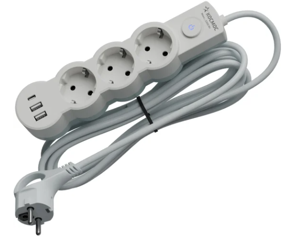 Удлинитель КОСМОС 3м, ПВС 3х1, 3 гнезда, заземление, IP20, выкл, USB, 220В 10А 2800Вт, белый