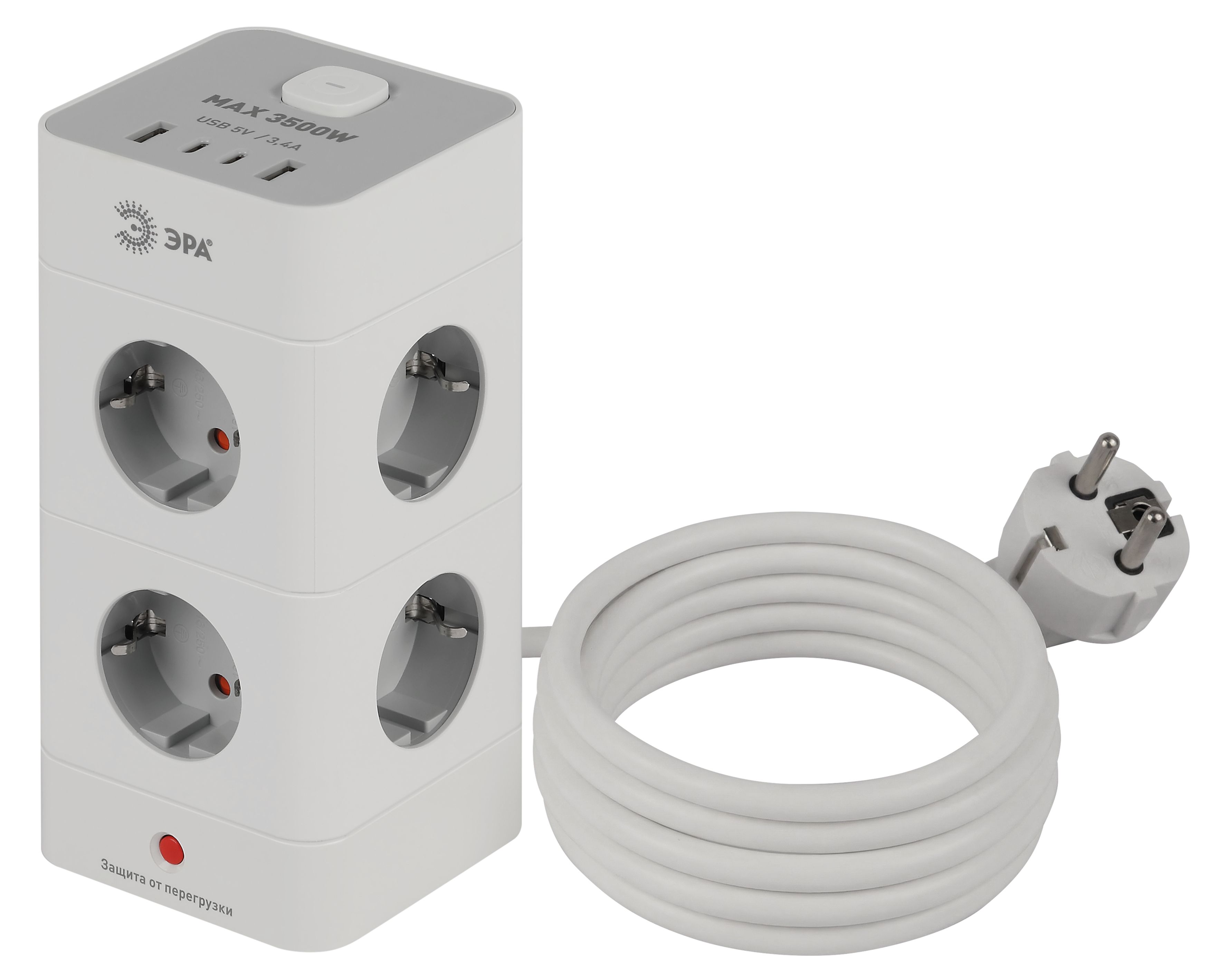 Сетевой фильтр Эра TWR-8es-1,5m-4USB-W рассчитан на одновременное подключение большого количества техники. На корпусе расположены 8 розеток с заземлением. Прочный корпус в виде башни из негорючего поликарбоната. Блок защиты подключаемых устройств включает термореле для защиты от короткого замыкания и перегрузки. При нагреве из-за превышения нагрузки термореле срабатывает и обесточивает все подключенные устройства. Трехжильный провод ПВС обеспечивает допустимую максимальную нагрузку до 3680 Вт. Правильно подбирайте бытовые приборы, чтобы не превышать общую нагрузку на сетевой фильтр. 4xUSBA+C 3,4A 5В~ 18Вт. Длина провода модели составляет 1,5 метра. Удлинитель удобно использовать в пределах одной комнаты.