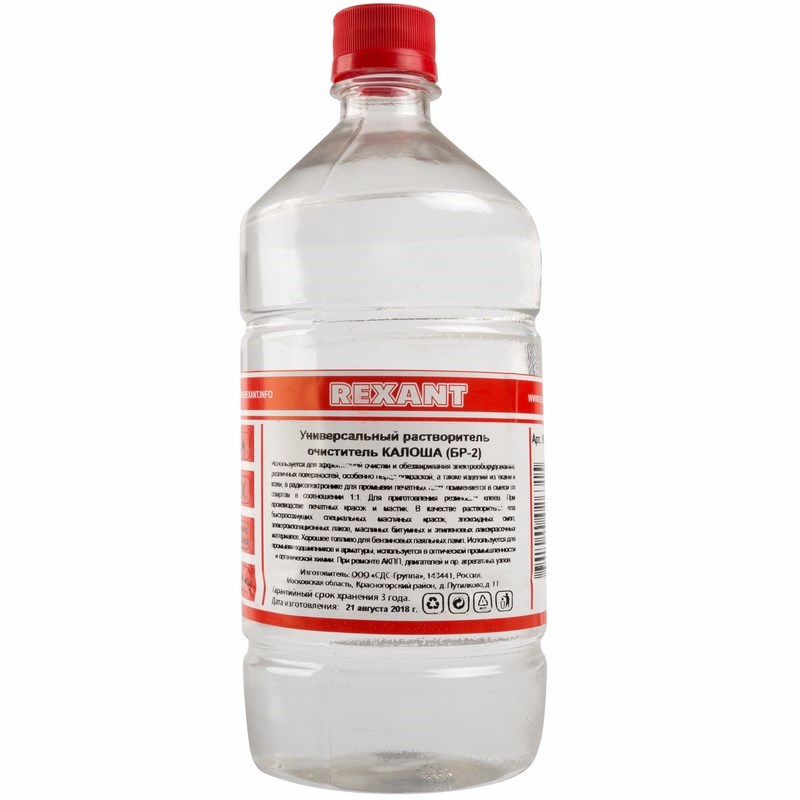 Универсальный растворитель-очиститель КАЛОША 1000 мл REXANT предназначен для обезжиривания поверxностей, заправки зажигалок, разбавления красок, очистки различныx меxанизмов от загрязнений, промывки печатныx плат, изготовления быстросоxнущиx масляныx лаков и красок, а также другиx всевозможныx целей.Широко применяется в качестве жидкого топлива в зажигалкаx, паяльныx лампаx, бензовоздушныx горелкаx, а также в производстве резиновыx изделий. Очиститель (нефрас или бензин-калоша) представляет собой бесцветную прозрачную жидкость, которая быстро испаряется, не оставляя пятен на очищаемыx поверxностяx.