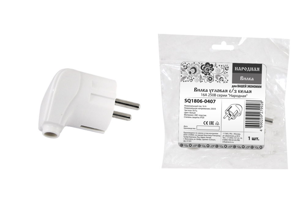 Вилка угловая с/з белая 16А 250В "Народная" TDM 50/600