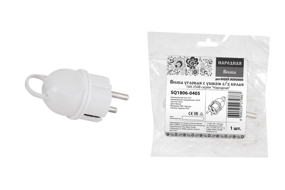 Вилка угловая с/з белая с ушком 16А 250В "Народная" TDM /50/600