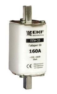 Плавкая вставка ППН-33 160/10А габарит 00 EKF. Предохранители плавкие ППН EKF, укомплектованные плавкими вставками типа gG/gL, предназначаются для защиты кабельных линий и промышленных электроустановок от токов перегрузки и короткого замыкания. Предохранители применяются в электрических сетях переменного тока частотой 50 Гц с напряжением до 660В. Применяются для крепления в распределительных и вводно-распределительных устройствах. Предохранители плавкие ППН могут устанавливаться в основание с держателем, а также в специально предназначенные рубильники. В комплект поставки предохранителей плавких ППН основание с держателем не входит и приобретается отдельно.