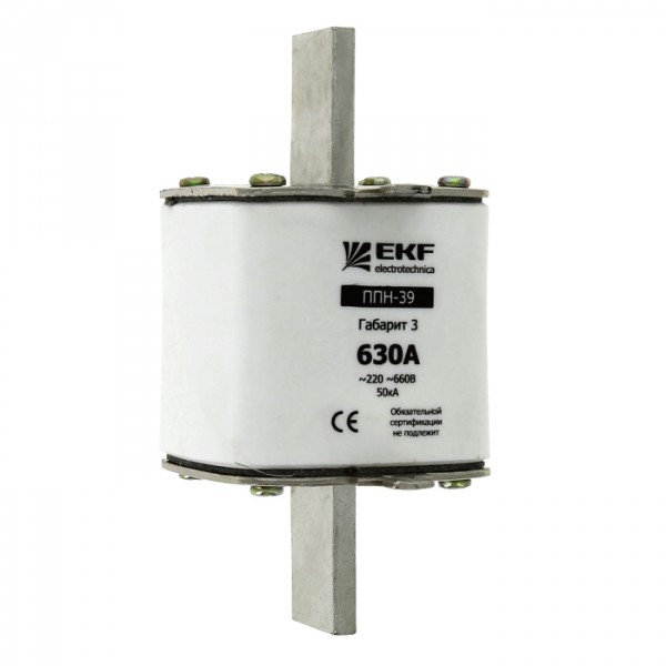 Плавкая вставка ППН-39 630/400А габарит 3 EKF. Предохранители плавкие ППН EKF, укомплектованные плавкими вставками типа gG/gL, предназначаются для защиты кабельных линий и промышленных электроустановок от токов перегрузки и короткого замыкания. Предохранители применяются в электрических сетях переменного тока частотой 50 Гц с напряжением до 660В. Применяются для крепления в распределительных и вводно-распределительных устройствах. Предохранители плавкие ППН могут устанавливаться в основание с держателем, а также в специально предназначенные рубильники. В комплект поставки предохранителей плавких ППН основание с держателем не входит и приобретается отдельно.