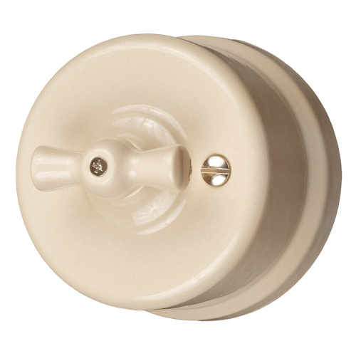 Изготовлен из экологически чистого материала – керамики. Имеет уникальный дизайн: оформлен в стиле ретро, оснащен поворотным переключателем вместо клавиши. Применяется с открытой проводкой, хорошо сочетается с текстильным кабелем. При необходимости может использоваться и при монтаже скрытой электропроводки.