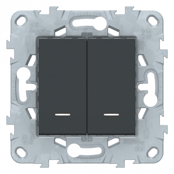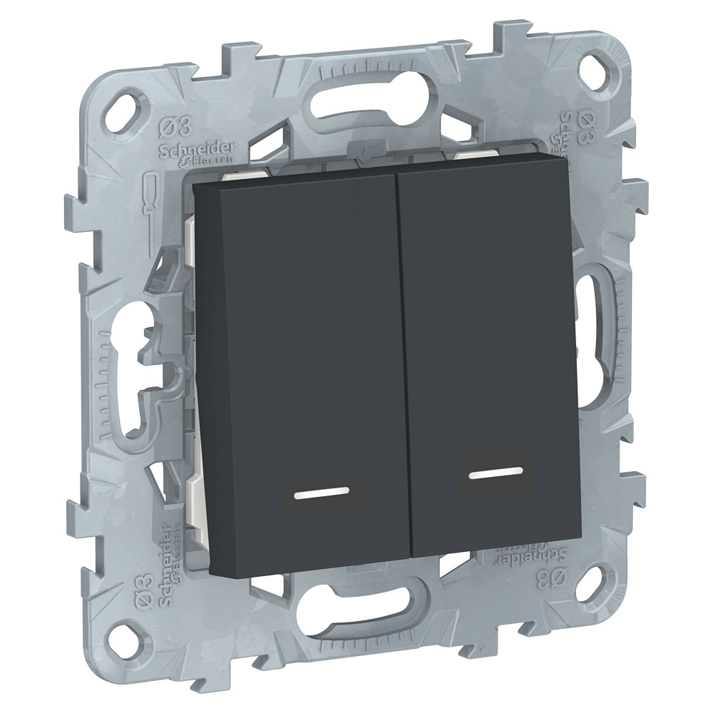 Выключатель двухклавишный Schneider Electric UNICA NEW (антрацит) с подсветкой предназначен для сетей до 250 В на ток до 10 А.- 2 нормально открытых контакта.