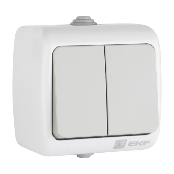 Выключатель двухклавишный EKF серии Мурманск позволяет организовать электроснабжение в условиях высокой влажности и пыльных помещениях, на улице при условии установки под навесом. Ступенчатые герметичные вводы с двух сторон изделия обеспечивают надежную защиту, позволяя использовать устройство в агрессивных условиях.