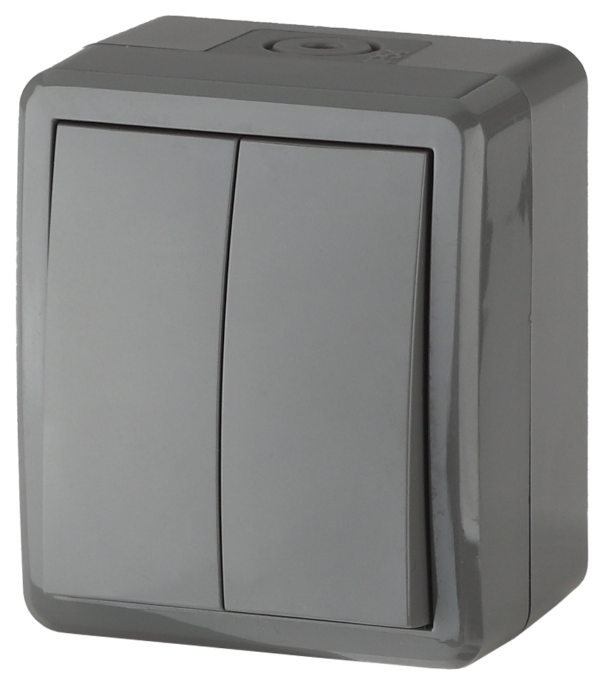 Выключатель влагозащищённый IP54 2-клавишный серии Эра Эксперт открытой уст. цвет серый 11-1404-03. Номинальные характеристики. Выключатель выполнен из качественного поликарбоната, оснащён уникальными винтовыми клеммами ЭКСПЕРТ для максимально качественного зажима кабеля в механизме.