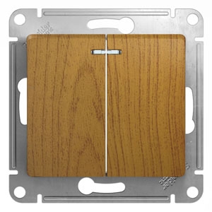 Механизм Systeme Electric (ранее Schneider Electric) серии Glossa (цвет дерево дуб) выключателя 2-клавишного с подсветкой подходит для сетей 250 В, на ток 10 А. Благодаря современной светодиодной подсветке зеленого цвета изделие легко найти в темноте. Двухклавишный выключатель позволяет управлять двумя источниками света с одной точки. Выполнен из материала PС+ASA, стойкого к УФ-излучению и появлению царапин. Эргономичные клеммы расположены в два ряда: сверху и снизу.