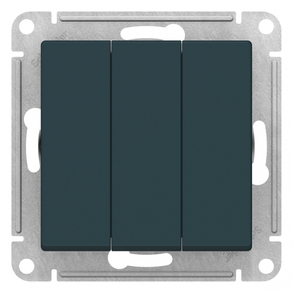 Механизм Systeme Electric (ранее Schneider Electric) серии AtlasDesign в цвете изумруд выключателя 3-клавишного подходит для сетей 250 В, на ток 10 А.- Трёхклавишный выключатель позволяет управлять тремя источниками света из одной точки.