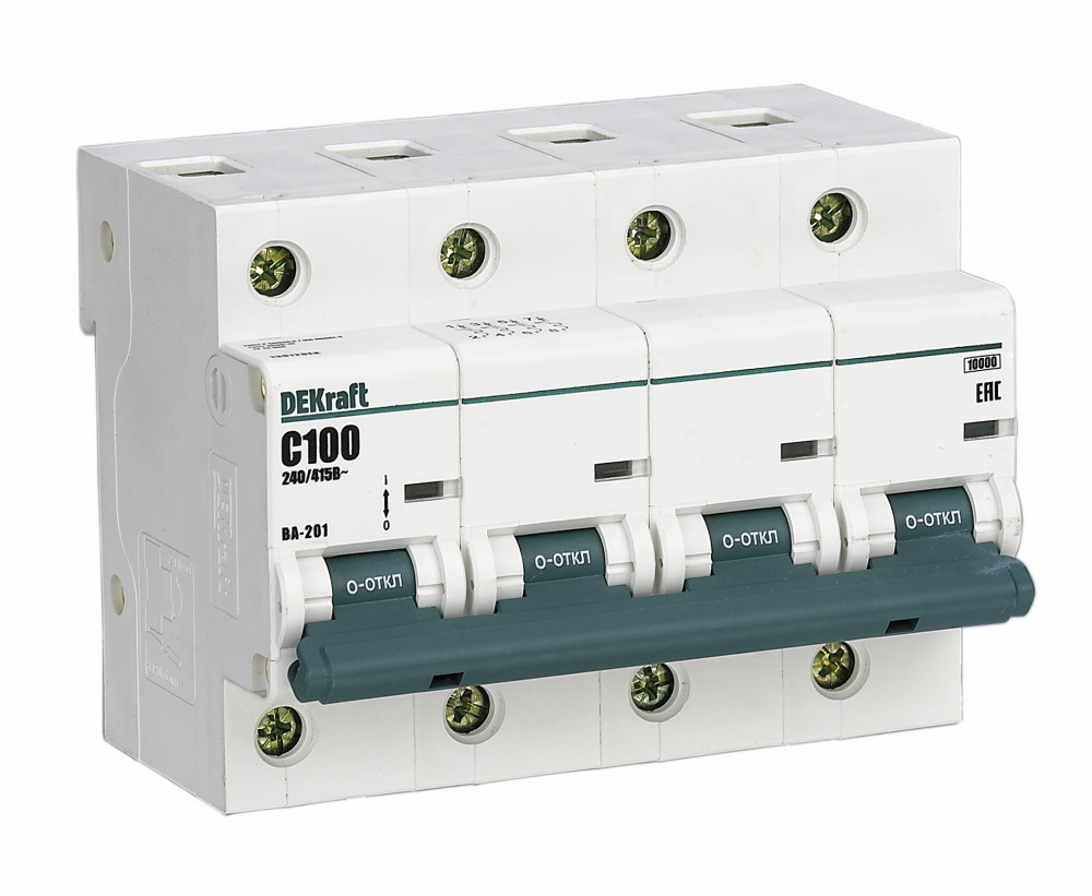 Автоматический выключатель серии ВА-201 DEKraft; 4P; номинальный ток 100 А; характеристика С; отключающая способность 10 кА; ширина модуля 27мм. Монолитная лицевая панель обеспечивает безопасную эксплуатацию аппарата. Окошко-индикатор всегда показывает состояние аппарата вне зависимости от положения рукоятки управления. Двухпозиционная защелка облегчает монтаж выключателя. Аппарат на 100% совместим с корпусами и оболочками DEKraft, Systeme Electric.