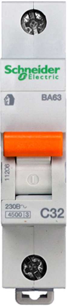 Автоматический выключатель ВА63 серии Домовой Schneider Electric, 1-полюсный на номинальный ток 32А, характеристика С, с отключающей способностью 4500А, ширина 18 мм.- Автоматические выключатели Домовой обеспечивают защиту цепей от токов перегрузки и короткого замыкания.
