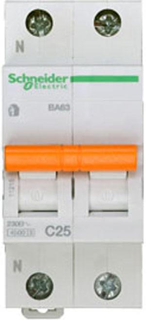 Автоматический выключатель ВА63 серии Домовой Schneider Electric, 1P + N, на номинальный ток 25А, характеристика С, с отключающей способностью 4500А, ширина 36 мм.- Автоматические выключатели Домовой обеспечивают защиту цепей от токов перегрузки и короткого замыкания.