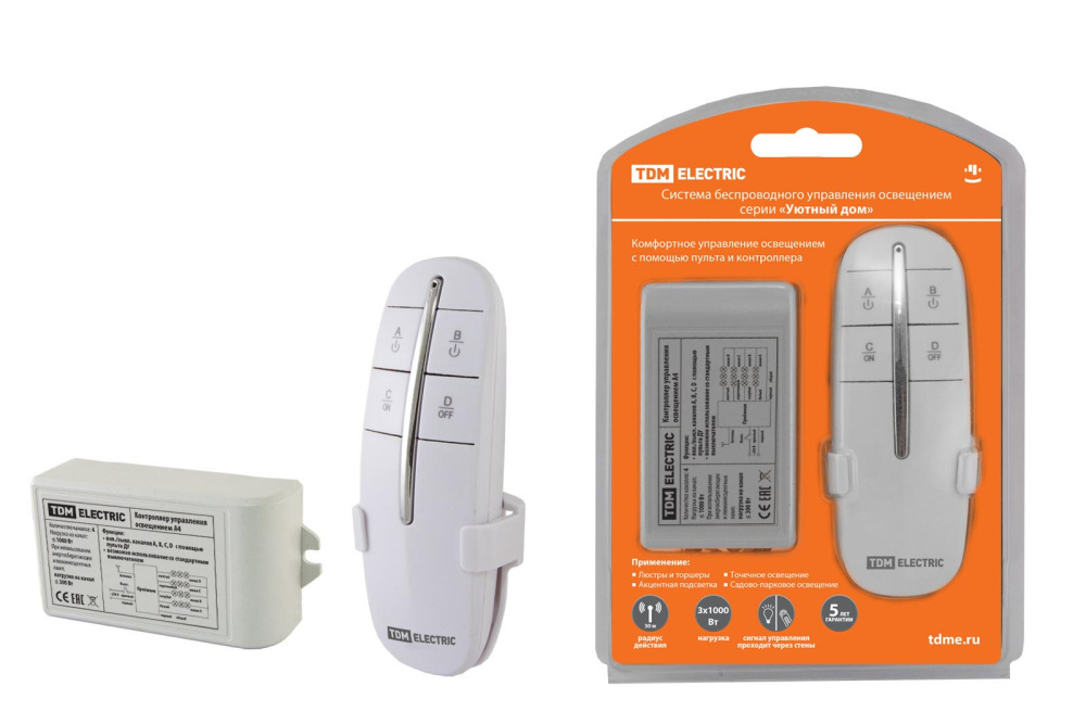 Применение:Дистанционное включение/отключение освещения:-люстры и торшеры;-акцентная подсветка;-точечное освещение;-садово-парковое освещение. Материалы:Пульты и контроллеры изготовлены из не поддерживающего горения пластика.Преимущества:Комфортное управление освещением.Полный базовый комплект для начала использования.Радиус действия до 30 метров.Удобное подключение и управление освещением, в том числе в люстрах.К контроллеру можно подключить до четырех каналов различных групп освещения (зависит от исполнения).Отсутствие необходимости прокладки дополнительных проводов, можно подключать к двухпроводной системе 2-4 канала нагрузки. Например : люстра+точечные светильники+светодиодная лента. Назначение:Для дистанционного беспроводного управления освещением. Конструкция:Пульт управления имеет в комплекте крепление на стену, фиксируемое к поверхности при помощи двухстороннего скотча (в комплекте) или при помощи саморезов.Передача сигнала осуществляется по радиочастоте 433,92 МГц.Управление осуществляется как при помощи пульта, так и с помощью стандартного настенного выключателя.