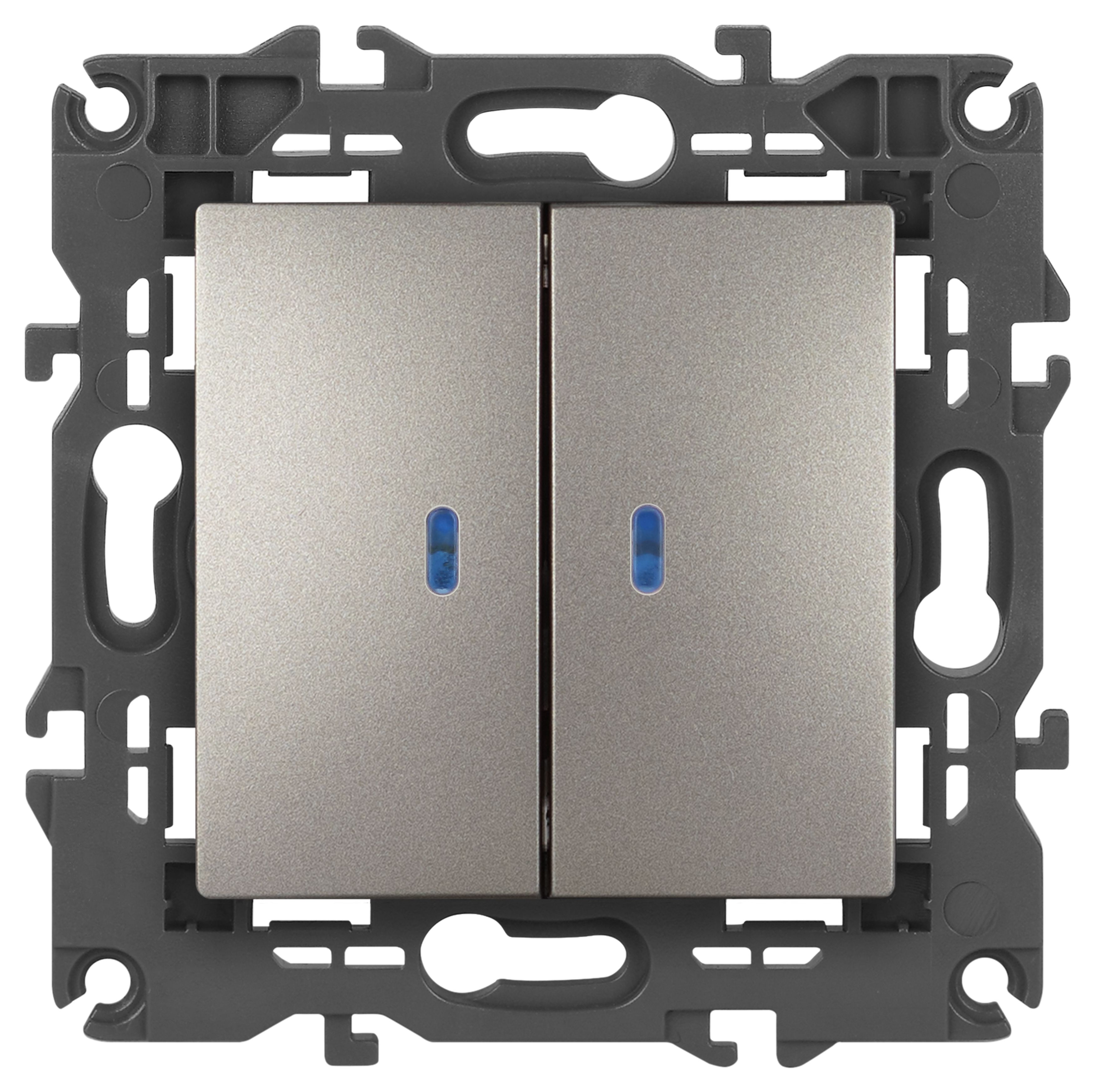 Выключатель 2-клавишный с подсветкой серии Эра Elegance цвет титан 14-1105-16. Характеристики 10А 250В. Оснащён автоматическими клеммами для надёжной фиксации жил кабеля в механизме. Рамки приобретаются отдельно.