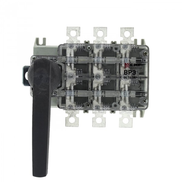 Выключатели-разъединители ВРЭ EKF PROxima предназначены для ручного включения-отключения цепей переменного тока номинальным напряжением до 500 В / 690 В (ВРЭ/ВРЭ с предохранителями) частотой 50 Гц, а также для защиты от коротких замыканий и перегрузки в моделях с плавкими предохранителями (предохранители в комплект поставки не включены). Двойной видимый разрыв цепи и прочный корпус с функцией дугогасительной камеры, выполненный из негорючего полиамида со стекловолокном, обеспечивают максимальную безопасность переключения. Фронтальная защита от прикосновений обеспечивается защитной крышкой. Применяются в качестве аварийного или главного выключателя для токов от 160 до 630 А во вводно-распределительных устройствах, распределительных и шкафах управления и др. Устанавливаются на монтажную панель. Конструктивно ВРЭ EKF PROxima состоит из трехполюсного основания с механизмом замыкания/размыкания контактов и дугогасительными камерами, прозрачной защитной крышки для визуального определения положения контактов и рукоятки. Конструкция контактных выводов обеспечивает болтовое присоединение шин или проводников, оконцованных кабельными наконечниками. Есть возможность установки замка для блокировки включения/отключения. Выключатели-разъединители ВРЭ EKF PROxima поставляются с передней рукояткой с возможностью выноса ее на дверцу шкафа. Выключатели могут дополнительно оснащаться электромеханическим дополнительным контактом состояния NO + NC.