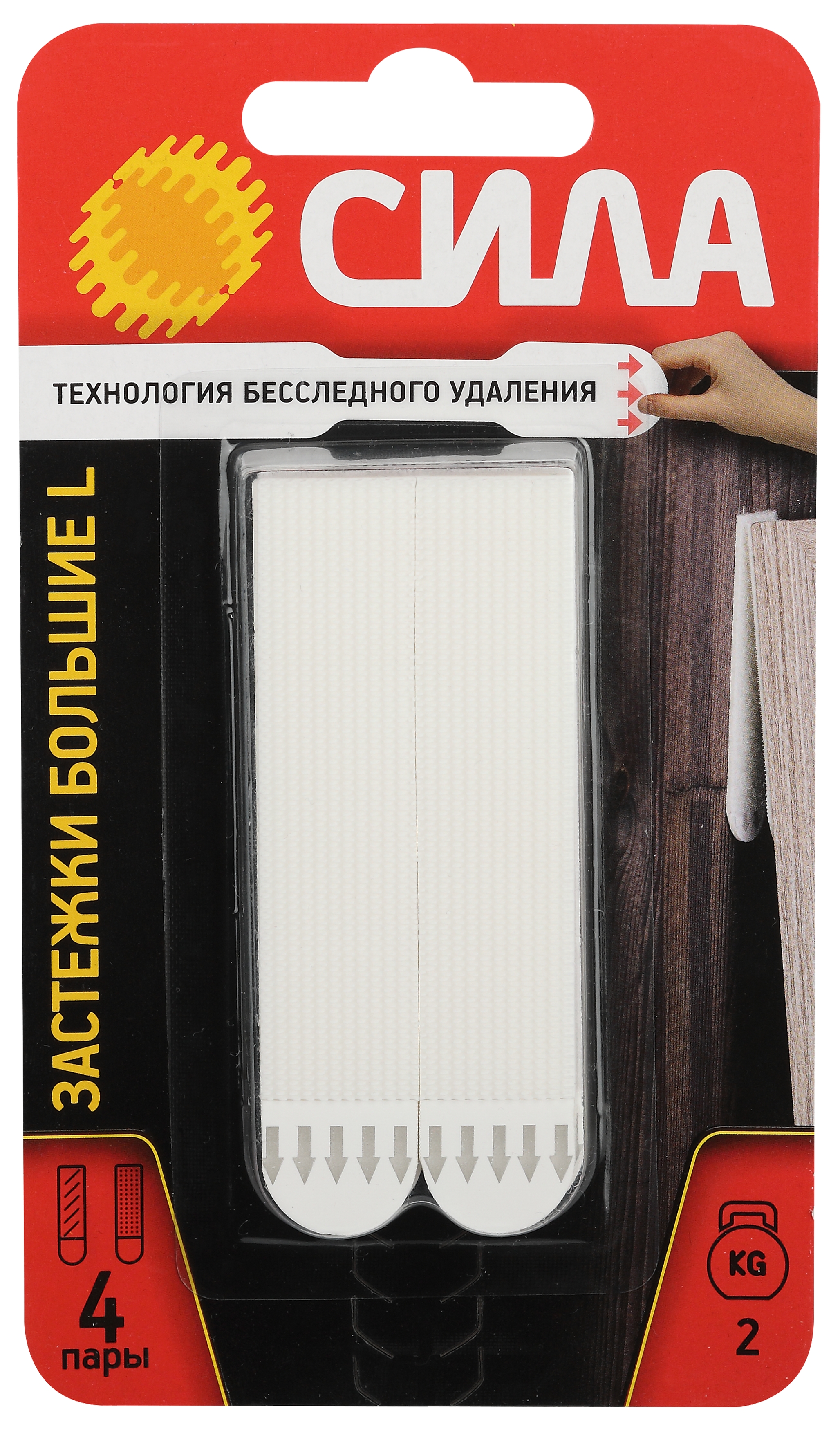 Застежки СИЛА с технологией бесследного удаления созданы специально для рамок, картин, плакатов, настенных часов, домофонов, роутеров и других предметов. Они легко удаляются, не повреждая стен. Все предметы зафиксированные настенными застежкам, легко и без следа заменяются. Одна застежка фиксируется на стене, а другая - на раме. Максимальная нагрузка: 2 кг на 1 пару или 8 кг на упаковку