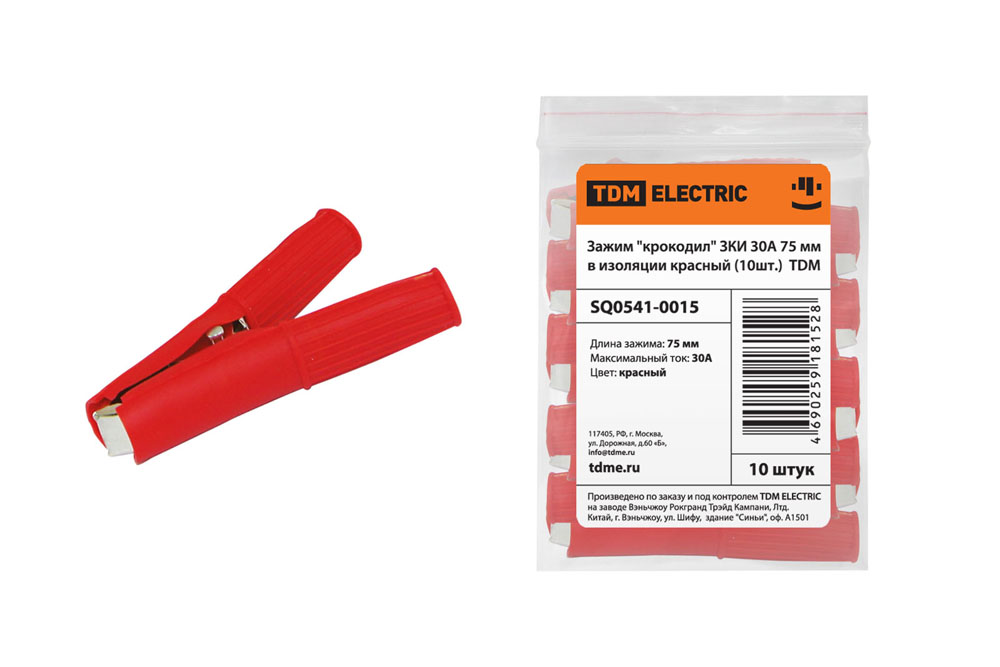Зажим "крокодил" 30А 75мм в изоляции красный (10шт) TDM ЗКИ 1/10/60