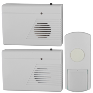 Беспроводной электрический дверной звонок с 2 динамиками в комплекте. Динамики можно с удобством разместить в разных комнатах или разных помещениях (актуально для дач и загородных домов с многочисленными постройками на территории). Радиус действия до 100 метров. Кнопка защищена от влаги и пыли (IP44). В числе преимуществ 6 встроенных мелодий и световой сигнал. Звонок работает от батареек: для кнопки - 1 шт А23 (входит в комплект), для каждого из динамиков - по 2 шт АА пальчиковые (в комплект не входят).